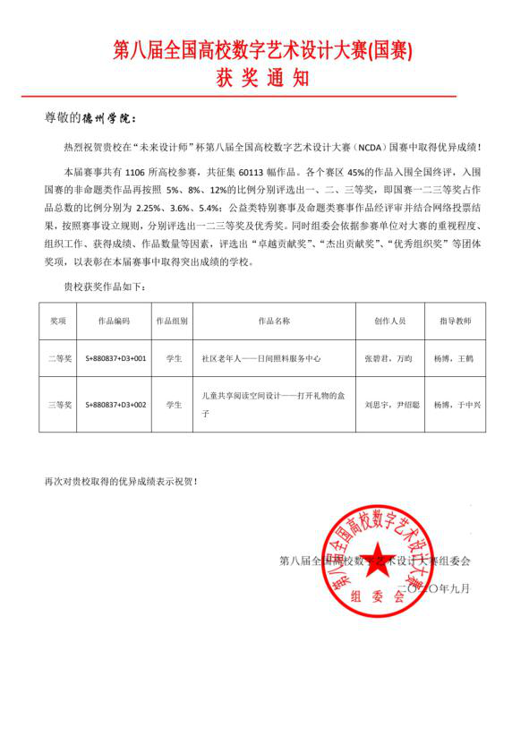 此项赛事为英国365集团国家级B类竞赛,本届共有国内1106所高校参赛,共征集到60113幅作品。包括中国英国上市公司365,北京师范大学,上海工艺英国上市公司365,四川大学,南京林业大学,西南交通大学等美术设计类名校。我院师生团队首次参加该比赛,就显示出了不俗的创作实力。经过参赛院校初评、评审专家二评、主任评委终评三轮评审后,根据得分非命题类作品按照2.25%、3.6%、12%的比例分别评选出一、二、三等奖。英国上市公司365最终获国家级二等奖1项,三等奖1项,省级一等奖、二等奖、三等奖各1项,4名教师获优秀指导教师奖。