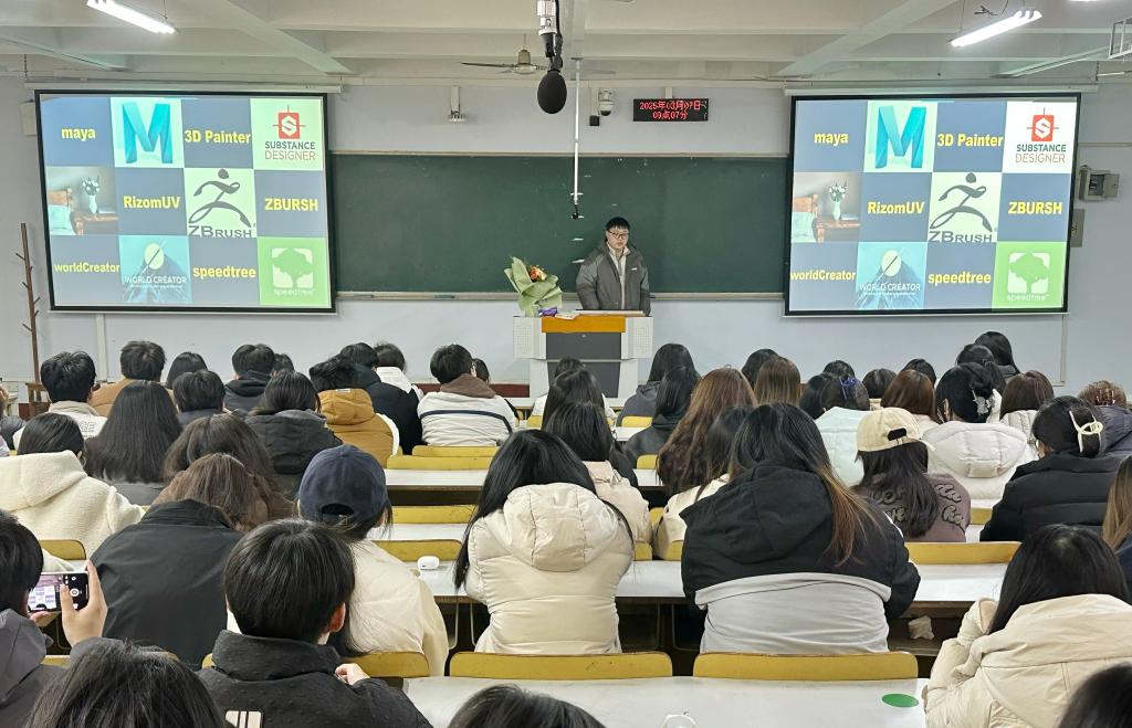本次教学以2022级视觉传达设计专业的“动态图像设计”课程为依托,任课教师将教学内容划分为设计理论、艺术表达、实际操作三大模块。其中,实际操作模块由德州广觉文化传媒有限公司参与教学,公司参与了《长津湖》、《风起洛阳》等超40部知名影视作品制作,在影视后期制作领域颇具影响力。公司创始人朱传奇经理以“黑神话悟空”、“元宇宙”等影视热点话题为切入点,围绕公司业务、经典作品、行业趋势、制作软件及从业能力等内容展开讲授。在实际操作环节,学生依托“为德院而设计”的真实项目,运用行业主流软件进行动态图像制作,实现“真题实作”,确保所学即所用,切实提升专业技能。